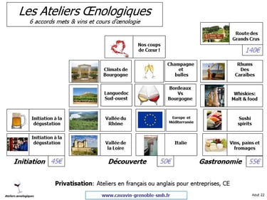 (ex: un Bon cadeau 'Découverte' permet de venir à ' Vallee du Rhone' ou ' Italie' , Un bon cadeau 'Gastronomie pêrmet de venir à 'Vins, pains et fromages' ou ' Whiskies' etc …)